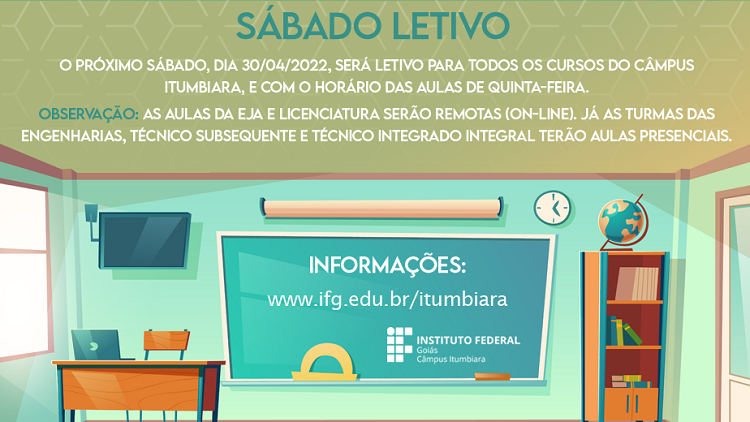 O próximo dia 30 de abril será sábado letivo para os estudantes do IFG Câmpus Itumbiara, conforme o Calendário Acadêmico. O horário corresponderá ao de quinta-feira, e em função da indisponibilidade de espaço físico para acomodar todas as turmas dos turnos vespertino e noturno, as aulas funcionarão da seguinte forma: