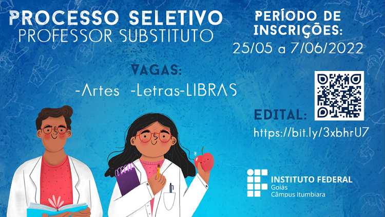 Seguem abertas até o dia 07 de junho as inscrições para contrato de Professor Substituto Temporário em duas áreas: Artes e Letras-Libras. As vagas são para o IFG Câmpus Itumbiara, e os dois profissionais selecionados serão contratados para trabalhar 20 horas semanalmente. As informações relativas à remuneração estão informadas no edital nº 016/2022, confira: http://www.ifg.edu.br/concursos/professor-substituto .