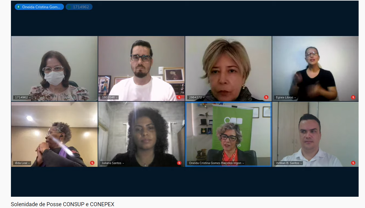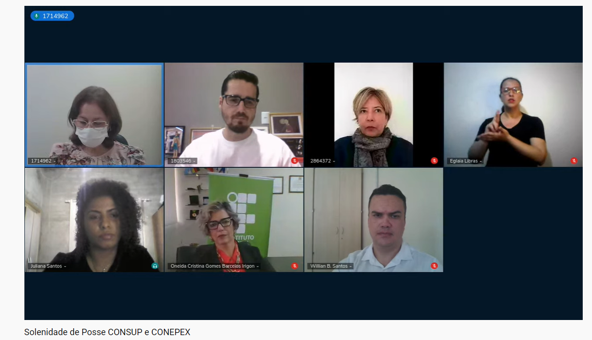 Participaram da cerimônia virtual a reitora do IFG e presidente do Conselho Superior, professora Oneida Cristina Gomes Barcelos Irigon; o pró-reitor de Extensão e presidente do Conepex, Willian Batista; a chefe de gabinete da Reitoria, Claudia Carrião Alves; a representante discente eleita para o Conepex, Juliana Santos; o docente eleito para o Conepex, Cristiano Aparecido da Costa; além de outros membros recém-empossados dos dois conselhos institucionais. Participaram também os intérpretes de Libras, Eglaia Nunes e Marcelo Bessa.