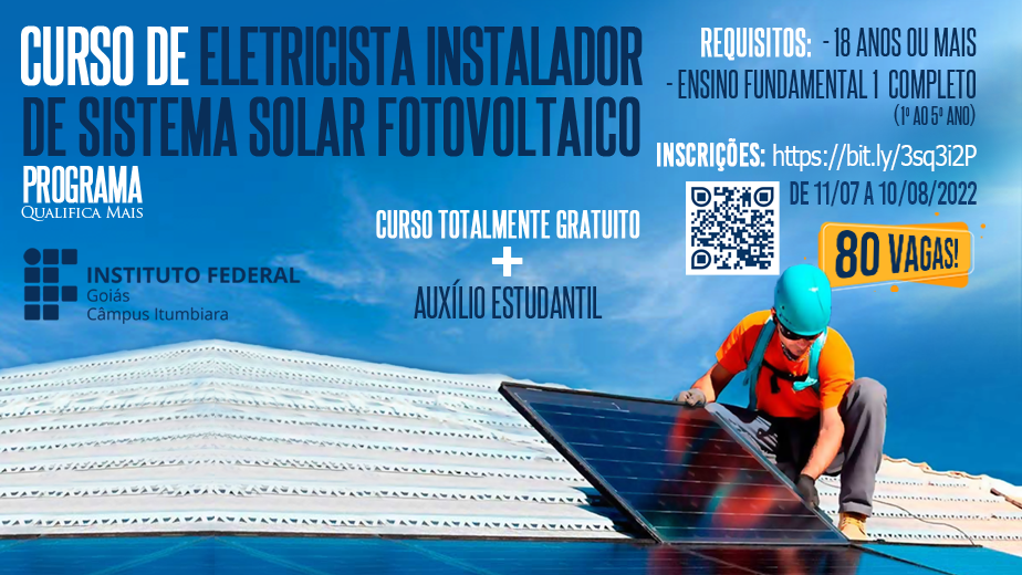 O curso de Curso de Eletricista Instalador de Sistema Solar Fotovoltaico será ofertado por meio da Gerência de Pesquisa, Pós-Graduação e Extensão e da Coordenação do Programa Qualifica Mais ENERGIF/Itumbiara. O principal objetivo é promover a ampliação da oferta de profissionais qualificados para o segmento de energia solar fotovoltaica na cidade de Itumbiara e região.  No curso, os alunos aprenderão a instalar, operar e manter sistemas fotovoltaicos on e off grid de acordo com as normas e procedimentos técnicos, garantindo assim qualidade e segurança da instalação.