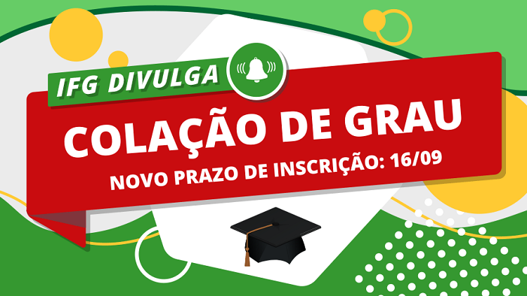 A Coordenação de Registros Acadêmicos e Escolares (Corae), do IFG Câmpus Itumbiara, informa que foi prorrogado o prazo para solicitação de inscrição na cerimônia de colação de grau 2022/1. O novo período para os alunos abrirem o processo de inscrição agora segue até 16 de setembro de 2022. A solenidade está marcada para o dia 29 de novembro, no auditório do Câmpus.