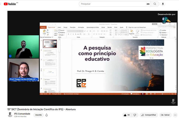 Mais de 250 trabalhos de pesquisa realizados por estudantes e servidores do IFG estão sendo apresentados  durante o 15º Seminário de Iniciação Científica e Tecnológica (15º SICT), que começou ontem, 22. O evento ocorre online e está sendo transmitido no canal do YouTube IFG Comunidade: www.youtube.com/c/IFGComunidade.