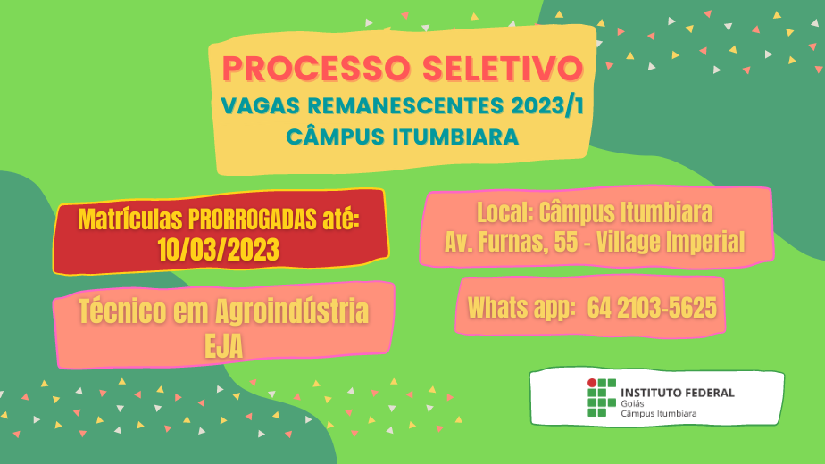Você está aqui: Página inicial > Editais > Pesquisa e Inovação - Em andamento > IFG > Câmpus > Itumbiara > Notícias do Câmpus Itumbiara > Câmpus Itumbiara oferta 28 vagas remanescentes para o curso Técnico em Agroindústria