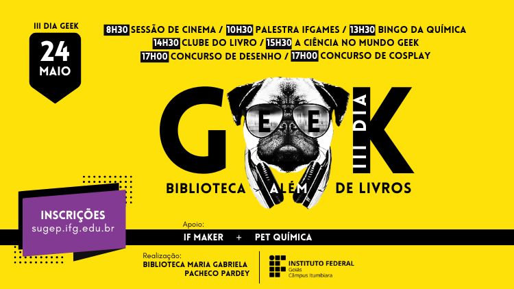 Os servidores da Biblioteca, com apoio do Grupo PET Química e Laboratório IFMaker, estão organizado a 3ª edição do Dia Geek, que é dedicado ao vasto universo da cultura nerd que envolve jogos, desenhos, pinturas, livros, filmes, música e muito mais. A atividade será realizada durante todo o dia de 24 de maio (veja a programação abaixo) e é voltada aos alunos do Câmpus Itumbiara.