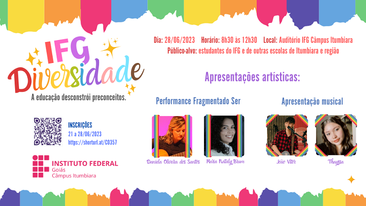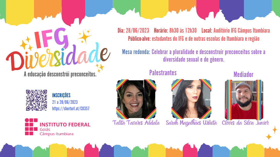 Você está aqui: Página inicial > Editais > Pesquisa e Inovação - Em andamento > IFG > Câmpus > Itumbiara > Notícias do Câmpus Itumbiara > “IF Diversidade” será realizado dia 28 e promoverá discussões acerca da diversidade sexual e de gênero