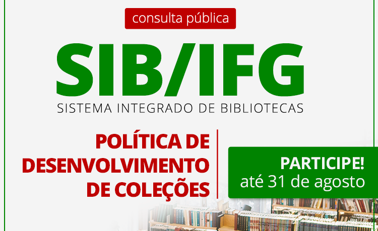 O Instituto Federal de Goiás (IFG), por meio da Pró-Reitoria de Pesquisa e Pós-Graduação e do Sistema Integrado de Bibliotecas, abriu ontem, 7 de agosto, processo de consulta pública da minuta da Política de Desenvolvimento de Coleções do SIB/IFG. Servidores do IFG poderão participar da consulta propondo alteração, inclusão e exclusão de artigos, incisos e parágrafos do documento.  As contribuições podem ser feitas até o dia 31 de agosto. As propostas devem ser encaminhadas via formulário eletrônico.