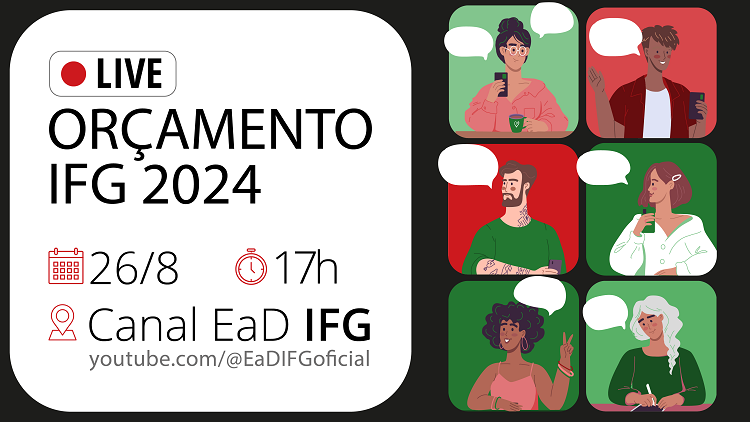 O Instituto Federal de Goiás (IFG) realizará, no dia 26 de agosto, uma live sobre o orçamento da Instituição. Participarão do evento, que será realizado de forma on-line, a reitora do IFG, professora Oneida Irigon, e o pró-reitor de Administração, Diego Xavier. O diretor executivo, professor Tauã Carvalho de Assis, será o mediador do evento. A live Orçamento IFG 2024 começará às 17h e contará com transmissão ao vivo pelo canal oficial da EaD IFG no YouTube.