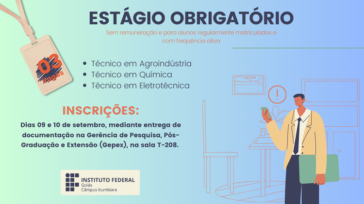 A Gerência de Pesquisa, Pós-Graduação e Extensão (Gepex), do IFG Câmpus Itumbiara, publicou o Edital nº 022/2024 com três vagas de Estágio Obrigatório Sem Remuneração, para os alunos dos cursos de Técnico em Agroindústria (01 vaga), Técnico em Eletrotécnica (01 vaga) e Técnico em Química (01 vaga). As inscrições acontecerão no período de 15h às 21h do dia 09/09 (segunda-feira) e das 07h às 13h, no dia 10/09 (terça-feira). A