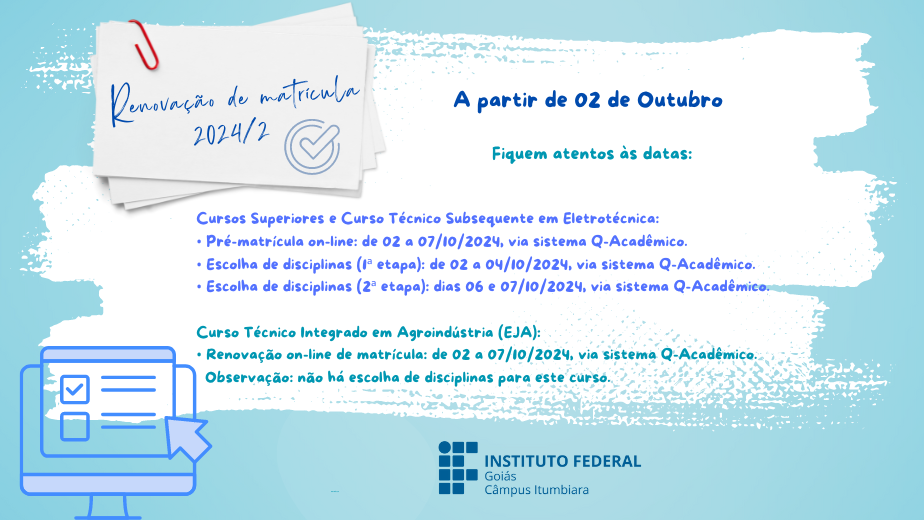 A Coordenação de Administração Acadêmica e Apoio ao Ensino (Caaae), do IFG Câmpus Itumbiara, informa que o período de renovação de matrícula terá início semana que vem, no dia 02 de outubro, e que ele é obrigatório para todos os estudantes do IFG que desejam continuar seus estudos e também para aqueles que têm o intuito de trancar a matrícula. A renovação, pré-matrícula e escolha de disciplinas são feitas, exclusivamente, pelo Q-Acadêmico, por meio do ID e senha pessoal (neste link http://academicoweb.ifg.edu.br/ ). Os estudantes dos cursos superiores de graduação e do Técnico Subsequente precisam, obrigatoriamente, fazer a escolha das disciplinas a serem cursadas no semestre, sob pena de desligamento, pois a escolha das disciplinas é uma das etapas da Renovação de Matrícula.