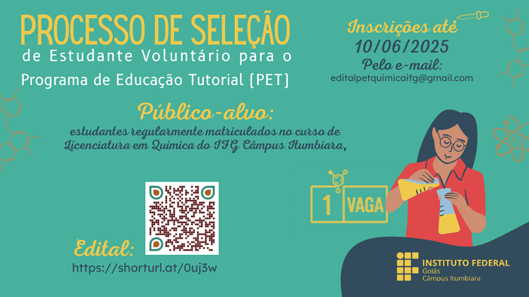 A Pró-Reitoria de Ensino (Proen), do Instituto Federal de Goiás (IFG), publicou o edital nº17/2025 para seleção de um (01) Estudante Voluntário para o Programa de Educação Tutorial do curso de Licenciatura em Química (PET Química). As inscrições serão realizadas até o dia 10 de junho, exclusivamente pela internet; e a vaga é para graduandos da Licenciatura do Câmpus Itumbiara.