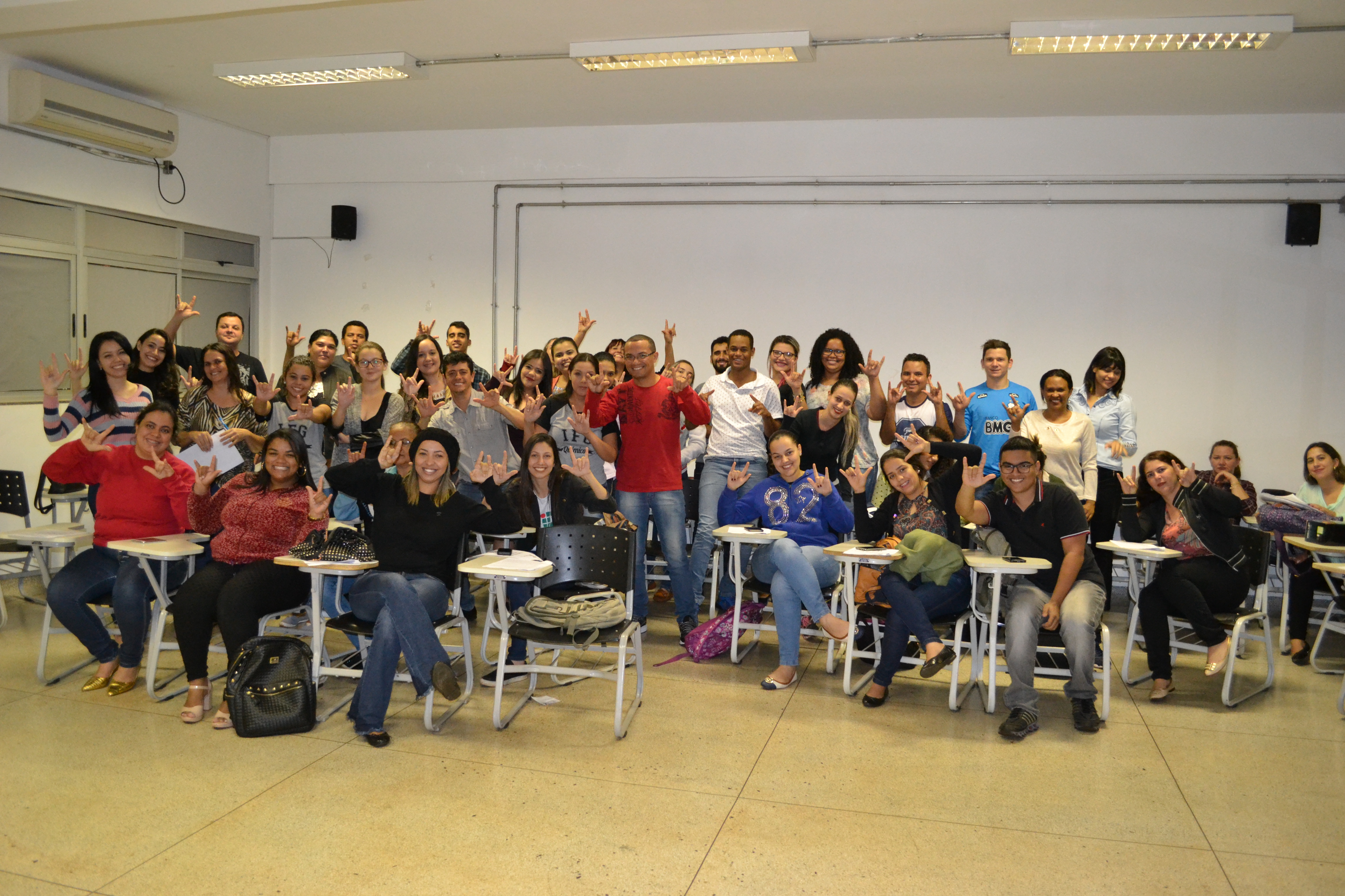 Participantes do seminário fazem gesto de "I love you" em Libras