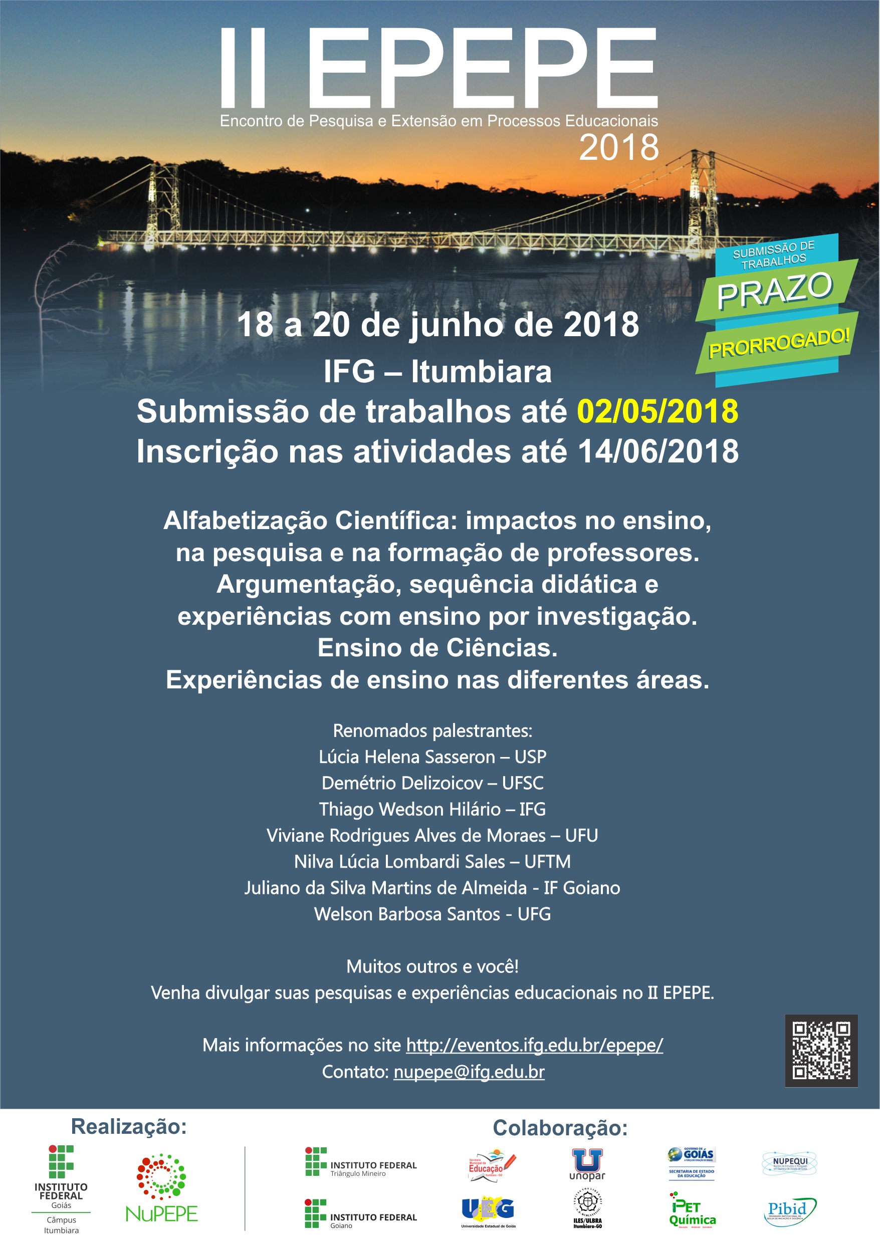 A Comissão Organizadora do II Encontro de Pesquisa e Extensão em Processos Educacionais (EPEPE) prorrogou até dia 02 de maio o prazo para submissão de trabalhos. Outra novidade é que este ano os melhores trabalhos completos do EPEPE serão revisados para a composição de um livro.