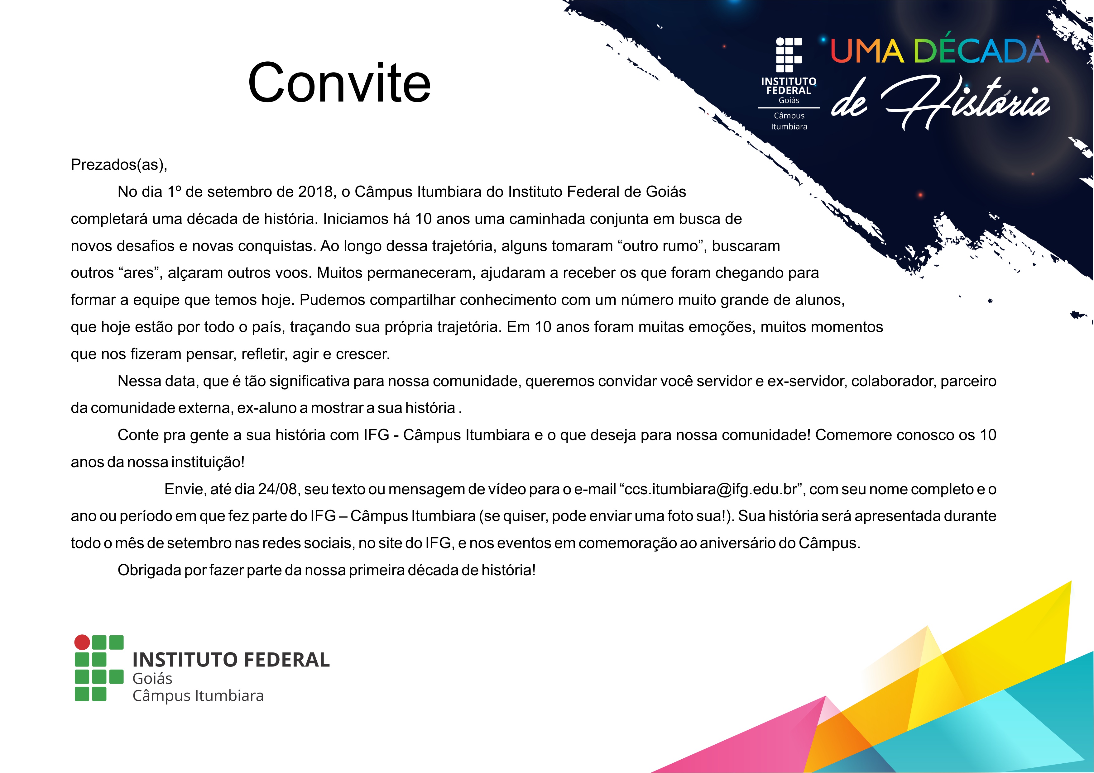 No dia 1º de setembro o IFG Câmpus Itumbiara completará dez anos de implantação. Por esse motivo, diversas ações estão sendo organizadas para celebrar essa primeira década de existência. Uma delas é direcionada a atuais e ex-servidores, colaboradores e ex-parceiros do Instituto além de alunos egressos, que estão sendo convidados a demonstrar, por meio de carta ou vídeo, um pouco de sua história e envolvimento com o Instituto.