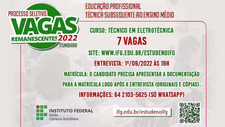 São ofertadas 57 vagas no IFG Câmpus Itumbiara. As inscrições são gratuitas