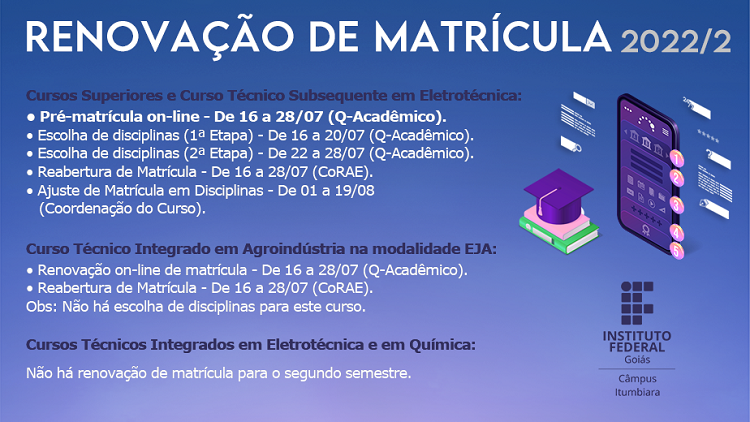 A renovação é obrigatória para alunos dos cursos superiores, subsequente em eletrotécnica e técnico em agroindústria