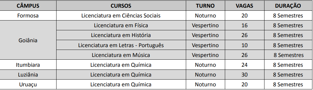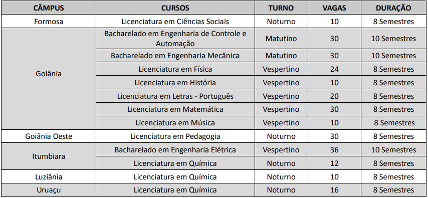 Para o Vestibular Enem, são oferecidas vagas nos câmpus Formosa (Licenciatura em Ciências Sociais); Goiânia (Bacharelado em Engenharia de Controle e Automação; Bacharelado em Engenharia Mecânica; Licenciatura em Física; Licenciatura em História; Licenciatura em Letras/Português; Licenciatura em Matemática; Licenciatura em Música); Goiânia Oeste (Licenciatura em Pedagogia); Itumbiara (Bacharelado em Engenharia Elétrica; Licenciatura em Química); Luziânia e Uruaçu (Licenciatura em Química). No ato da inscrição, que pode ser feita até o dia 26 de maio, os alunos podem usar a nota do Enem de uma das seguintes edições: 2013, 2014, 2015, 2016, 2017 ou 2018. O edital pode ser conferido aqui.