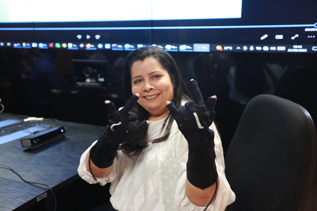 Após a apresentação de um vídeo explicativo sobre o projeto, foi realizada uma demonstração prática sobre o funcionamento das luvas transceptoras. A apresentação foi realizada pelos pesquisadores do IFG, Wesley Pacheco (coordenador) e Waléria Vaz, e contou com o apoio do professor Paulo Victor dos Santos, do Instituto Einsten. Também participaram da reunião, a pró-reitora de Pesquisa e Pós-Graduação, Lorena Pereira de Souza Rosa, instância na qual o projeto está vinculado, e a diretora de Comunicação Social do IFG, Adriana Souza Campos, que acompanha o projeto há alguns anos.