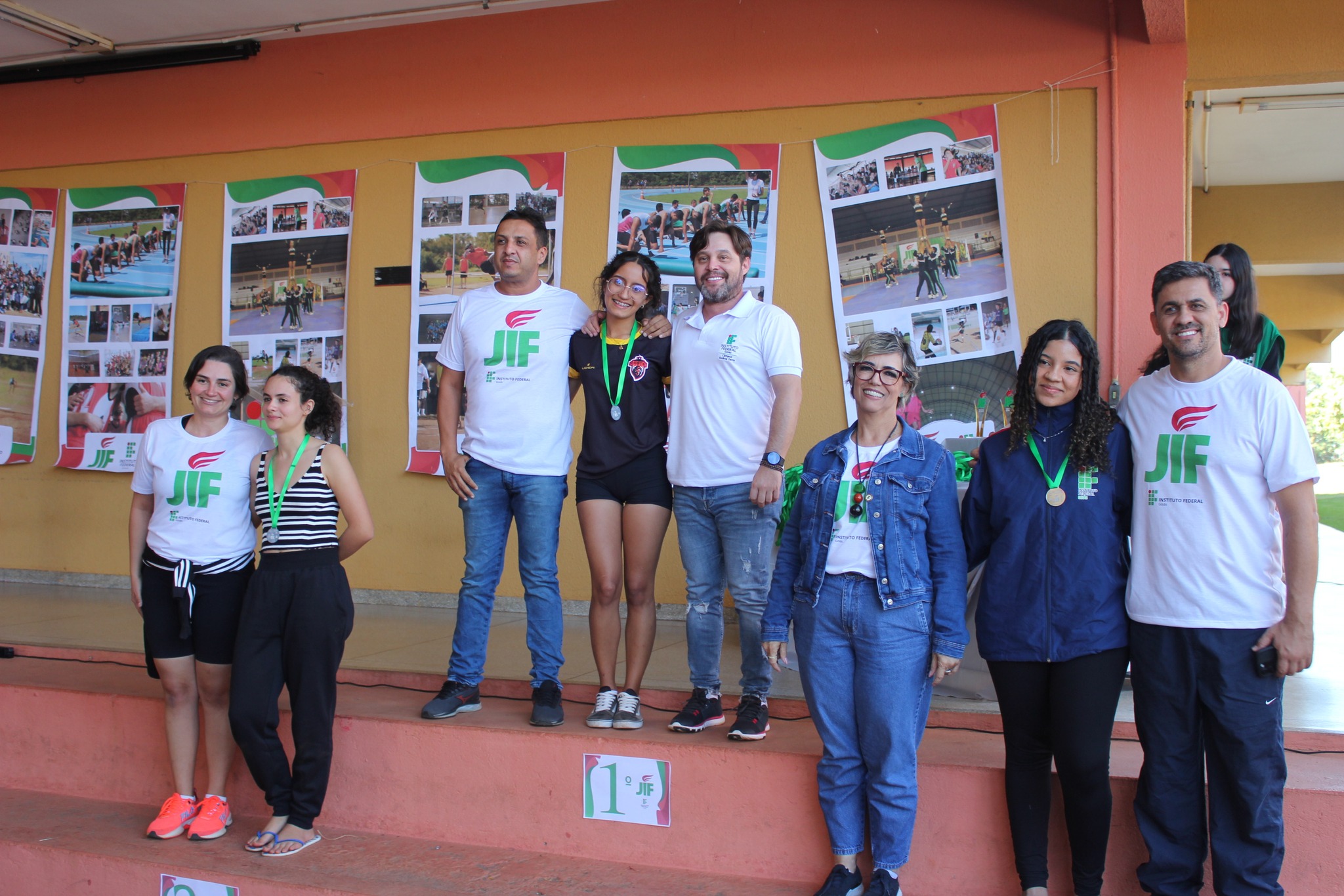Professora Oneida e outros servidores, incluindo a professora Danielle Batista do Câmpus Luziânia, participam da entrega de medalhas aos atletas no Câmpus Inhumas.