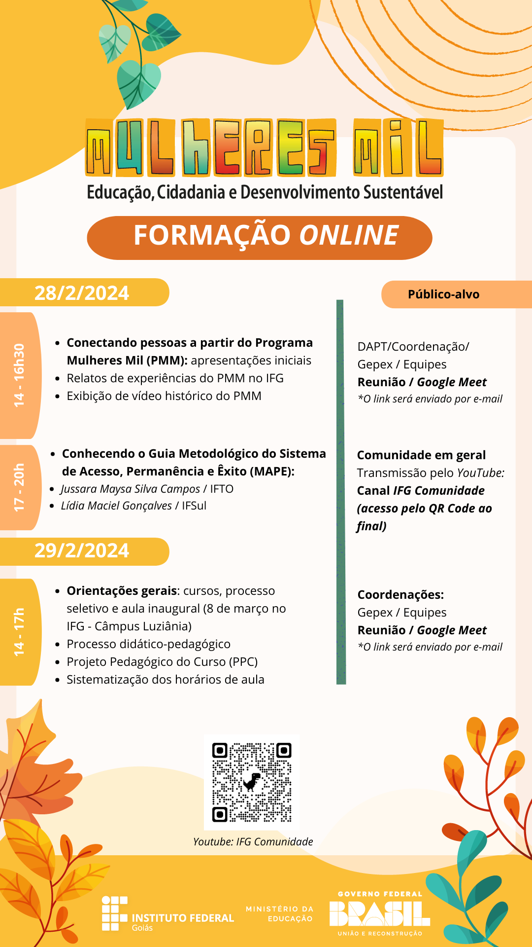Na programação da formação online, está presente uma roda de conversa intitulada “Conectando pessoas a partir do Programa Mulheres Mil”. Nessa atividade, terá apresentações e relatos de experiência sobre o PMM no IFG.