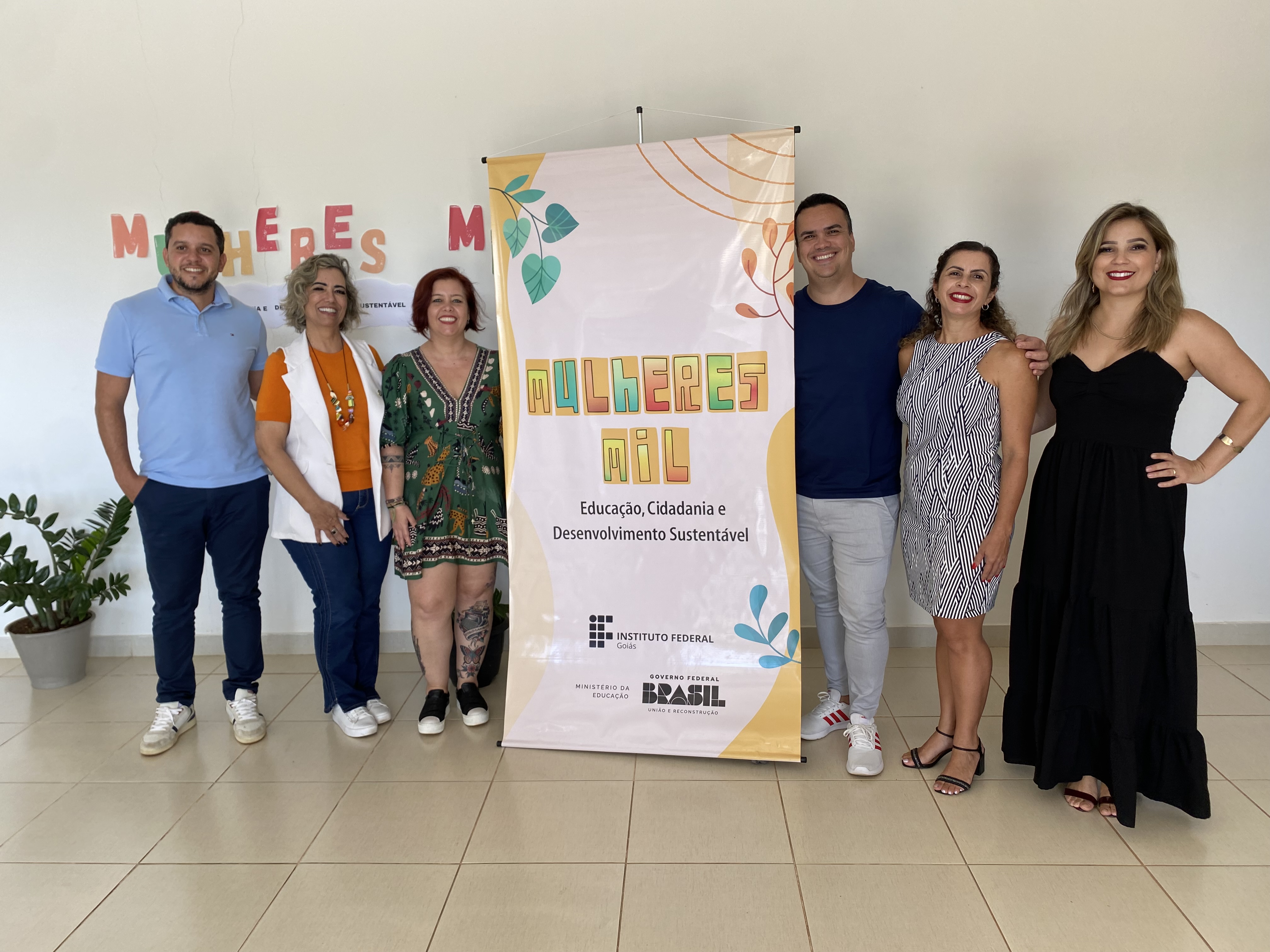 Equipe gestora do Programa Mulheres Mil no IFG (da esq. para dir.: Gepex do Câmpus Formosa, Bruno Leal; Reitora do IFG, Oneida Irigon; coordenadora-geral do Mulheres Mil, Kaithy Oliveira; pró-reitor de Extensão do IFG, William dos Santos; Gepex do Câmpus Luziânia, Simone Paixão; e diretora de Ações Profissionais e Tecnológicas da Pró-Reitoria de Extensão, Marluce Silva Sousa .