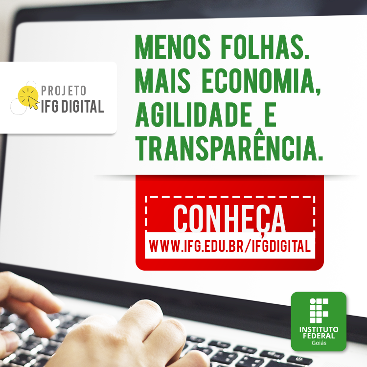 O Projeto IFG Digital tem por intuito implantar uma estrutura de processos e documentos eletrônicos no Instituto e, com isso, sair da cultura do papel e caminhar para uma cultura digital. Visa ainda melhorar o desempenho dos processos no IFG, com ganhos em agilidade, produtividade, transparência, satisfação do usuário e redução dos custos.