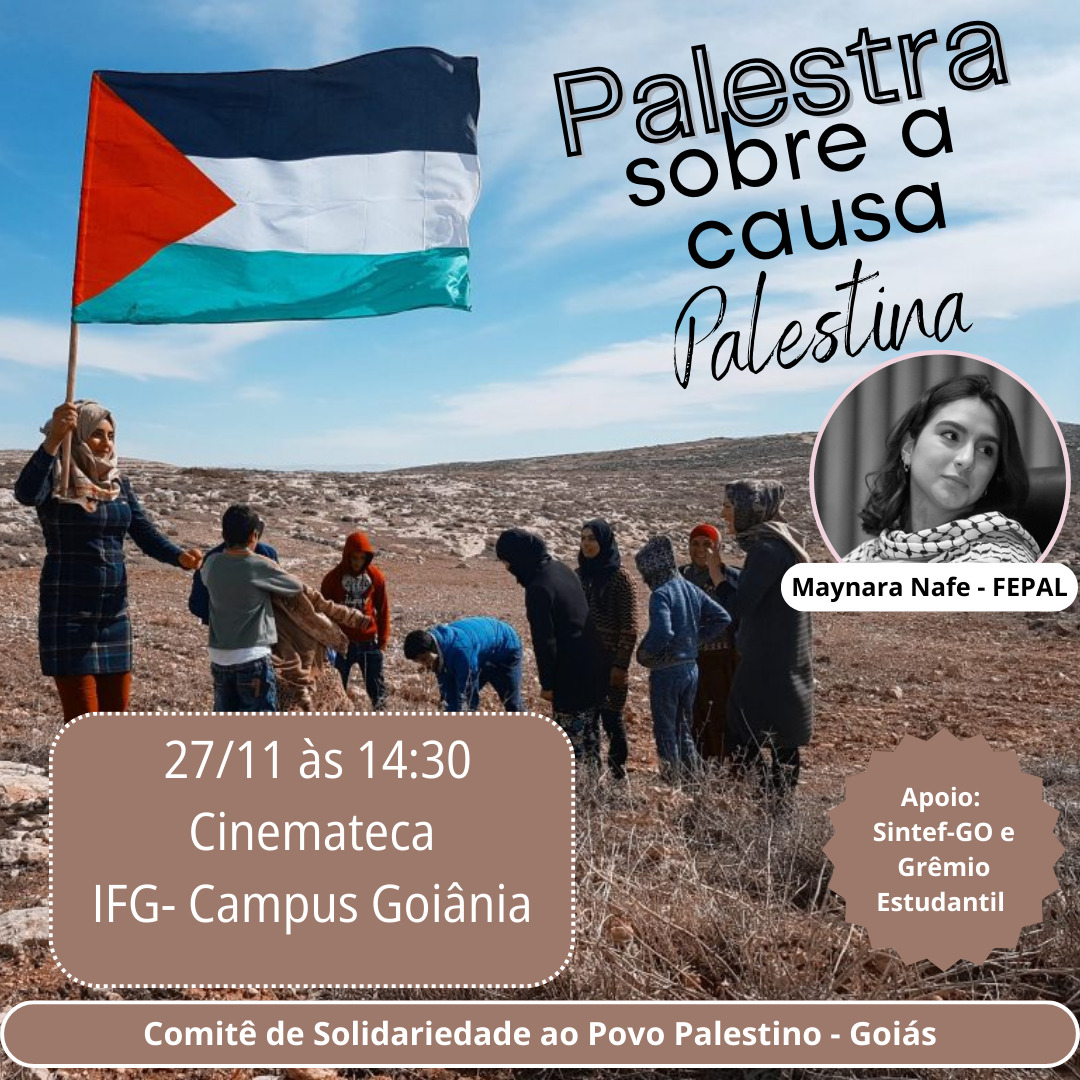 O Câmpus Goiânia do Instituto Federal de Goiás (IFG) recebe nesta segunda-feira, 27 de novembro, a Palestra sobre a causa palestina, com Maynara Nafe, da Secretaria da Juventude da Federação Árabe Palestina no Brasil (Fepal). O evento é uma ação do Sindicato dos Trabalhadores em Instituições Federal de Educação Profissional e Tecnológica – Goiás (Sintef-GO) e será aberto à comunidade do câmpus.