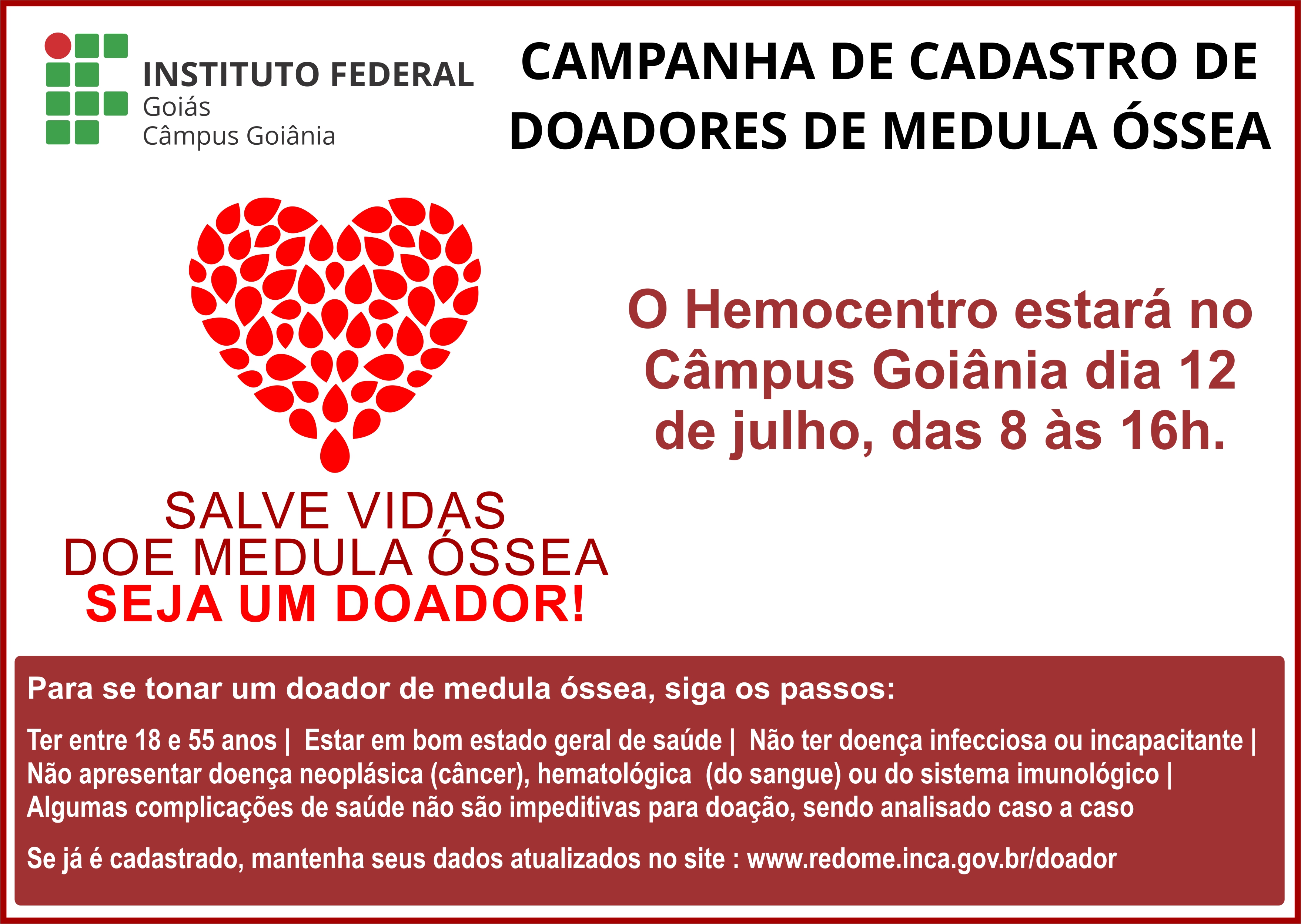 O Instituto Federal de Goiás (IFG) – Câmpus Goiânia participa da Campanha Nacional de Cadastro de Doadores de Medula Óssea, com objetivo de sensibilizar a comunidade acadêmica para que mais pessoas se cadastrem no Registro Nacional de Doadores Voluntários de Medula Óssea – Redome, podendo salvar milhares de vidas que necessitam de transplante de medula óssea em todo país.