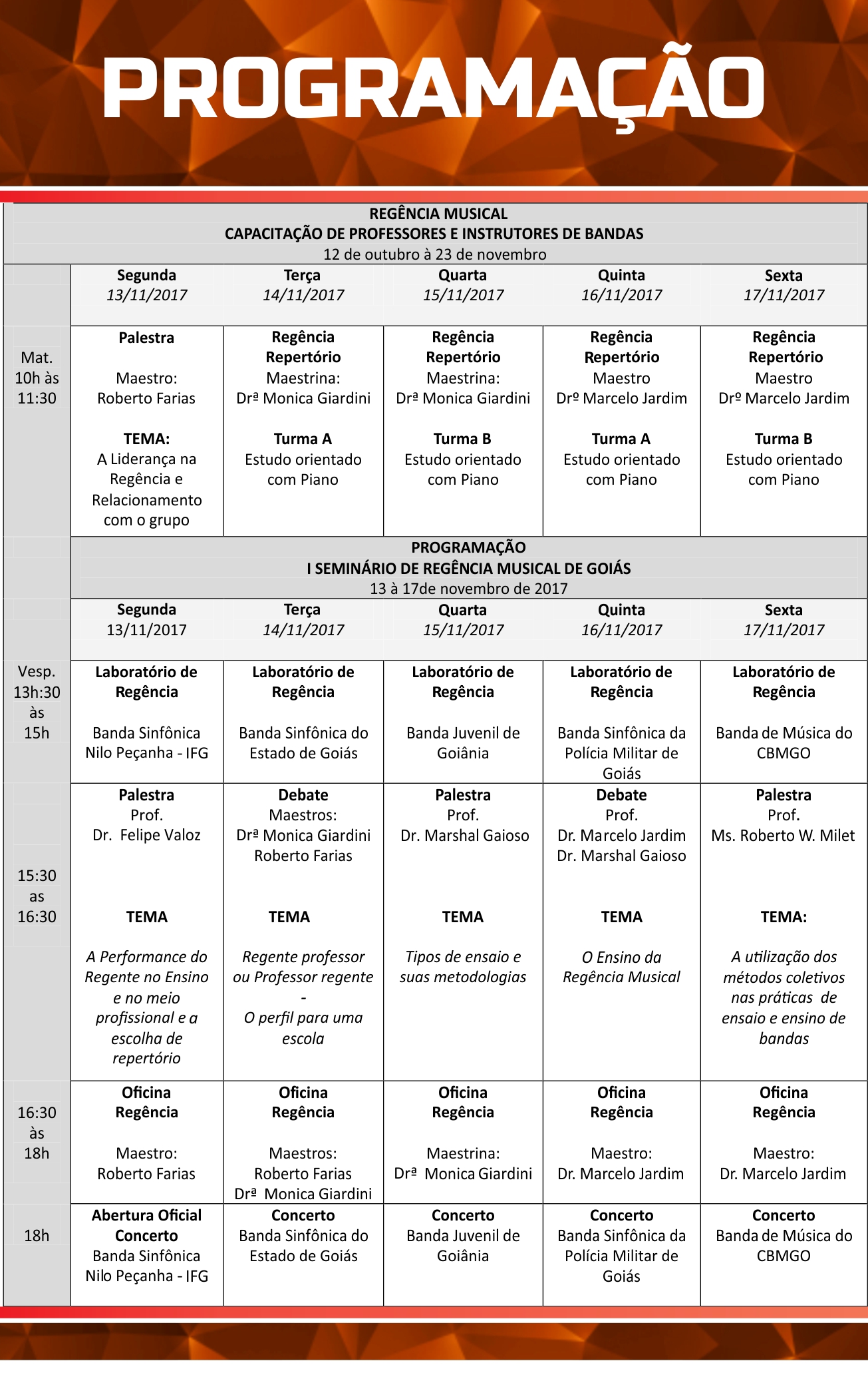 O seminário traz renomados regentes do cenário nacional, dentre eles a Dra. Monica Giardini, regente da Banda Sinfônica do Estado de São Paulo; maestro Roberto Farias, regente da Banda Sinfônica de Cubatão; e o Dr. Marcelo Jardim, maestro e professor da Universidade Federal do Rio de Janeiro. Do IFG - Câmpus Goiânia, marcam presença os professores Marshal Gaioso, Felipe Valoz, Roberto Wagner Milet e Marcelo Eterno.