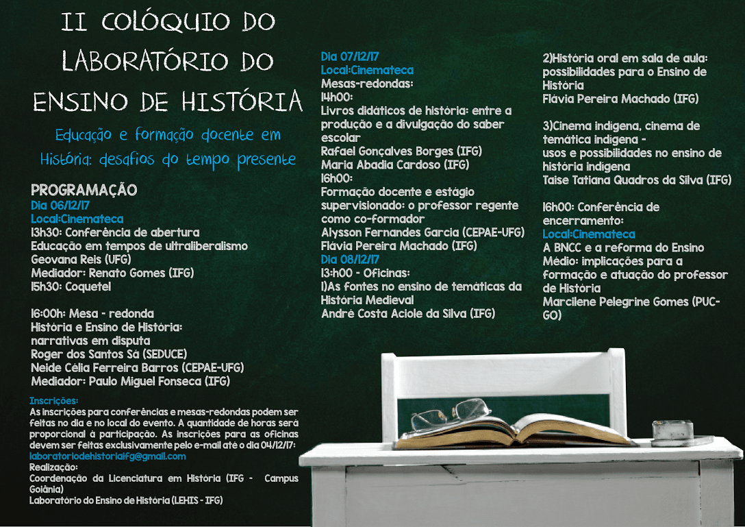 O Câmpus Goiânia do Instituto Federal de Goiás (IFG) realiza, entre os dias 6 e 8 de dezembro, o II Colóquio do Laboratório do Ensino de História. Na programação, irão ocorrer conferências, mesas-redondas e oficinas abertas a estudantes, docentes e pesquisadores interessados na temática Educação e Formação Docente em História: desafios do tempo presente.