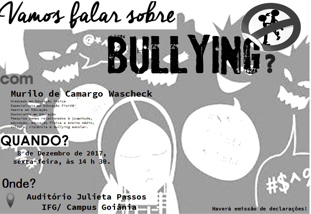 Estudantes do Câmpus Goiânia estão convidados a participarem da palestra: Vamos Falar sobre Bullying?, que será realizada no dia 8 de dezembro (sexta-feira), às 14h30, no auditório Julieta Passos, no câmpus. Serão emitidas declarações de horas complementares aos participantes.