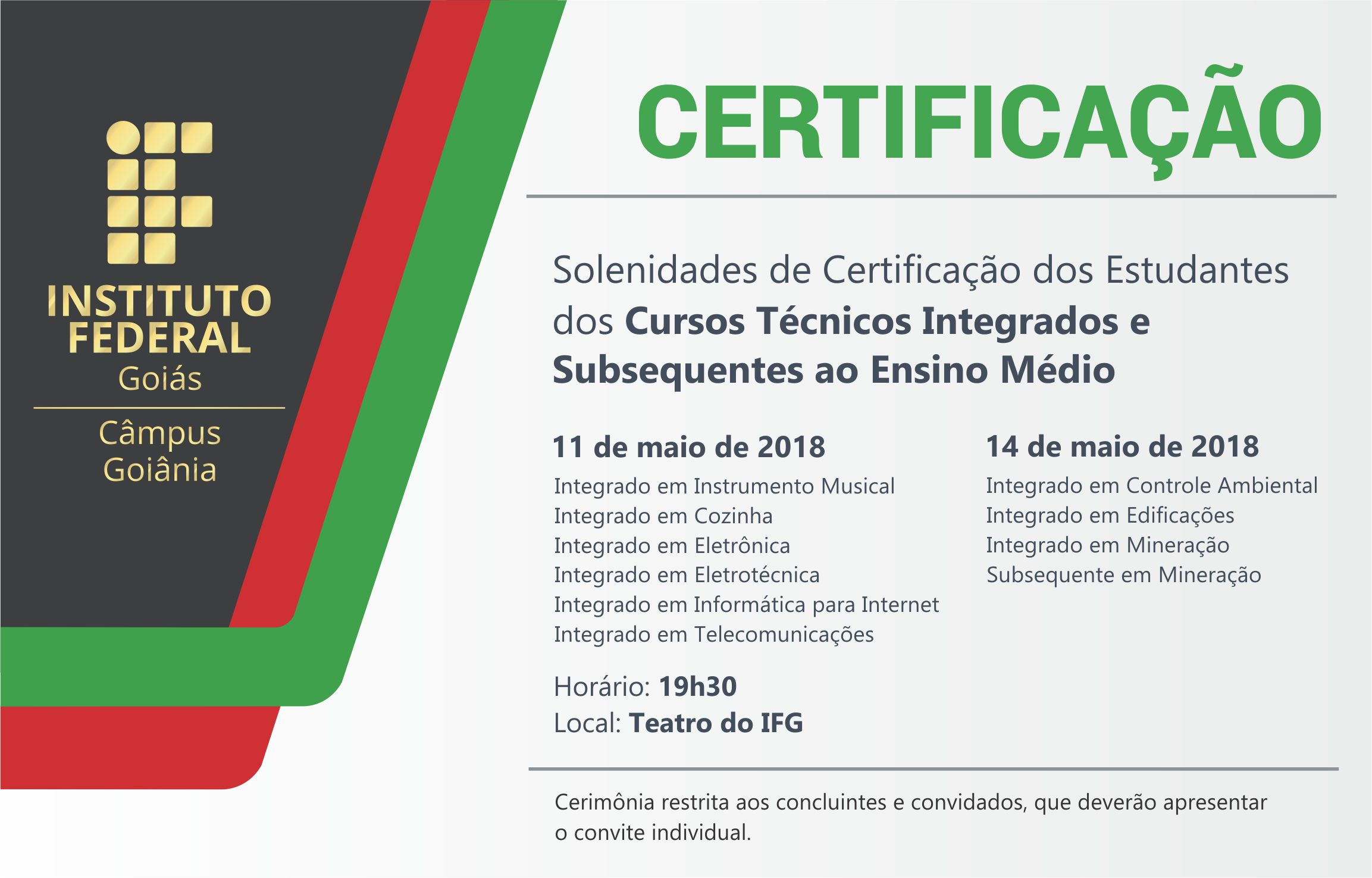 No dia 14 de maio, às 19h30, ocorrerá a certificação dos concluintes dos cursos técnicos integrados em Controle Ambiental, Edificações, Mineração e subsequente em Mineração, no Teatro do IFG – Câmpus Goiânia.