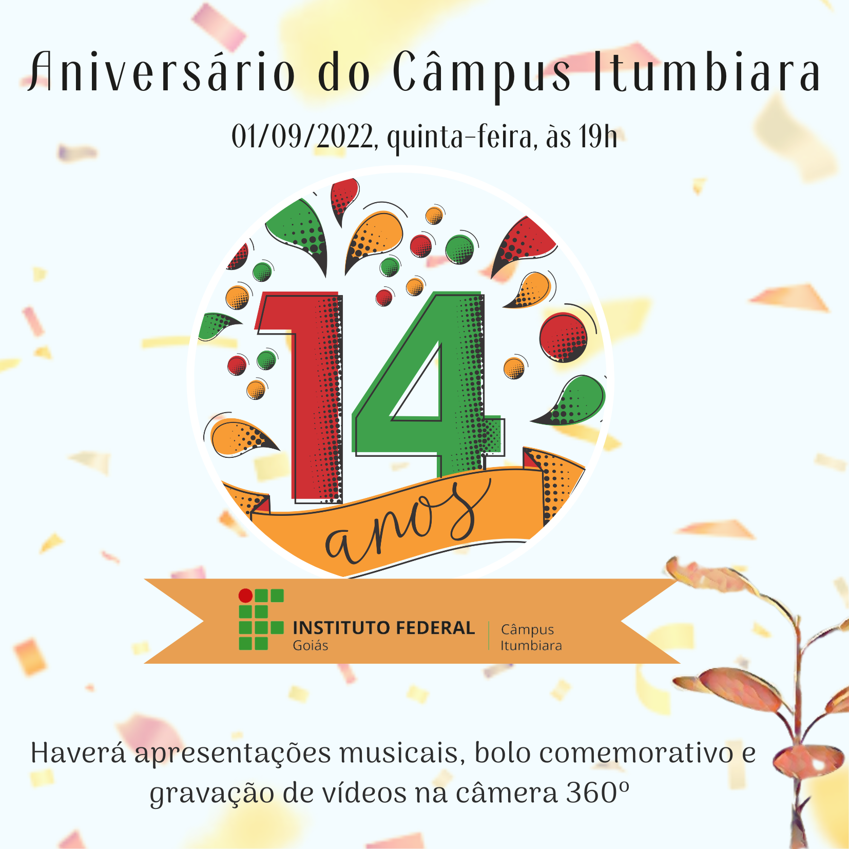 O IFG Câmpus Itumbiara convida a comunidade acadêmica (alunos, servidores e colaboradores terceirizados) para as atividades comemorativas aos 14 anos de implantação da Unidade, no próximo dia 1º de setembro, quinta-feira.