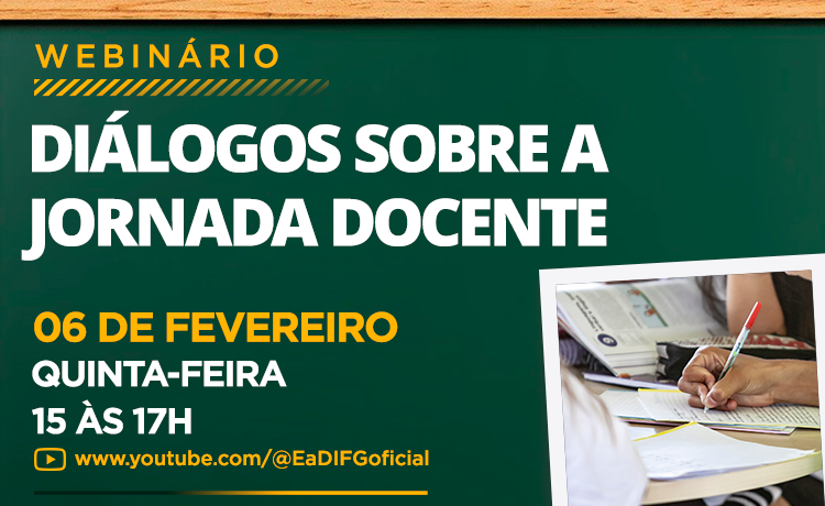 Na próxima quinta-feira, dia 06 de fevereiro, acontecerá um Webinário com o tema "Diálogos sobre a Jornada Docente", das 15h às 17h.