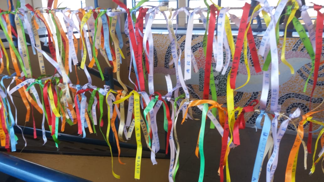 Cada cor de fita simboliza um desejo diferente na atividade da disciplina de Arte