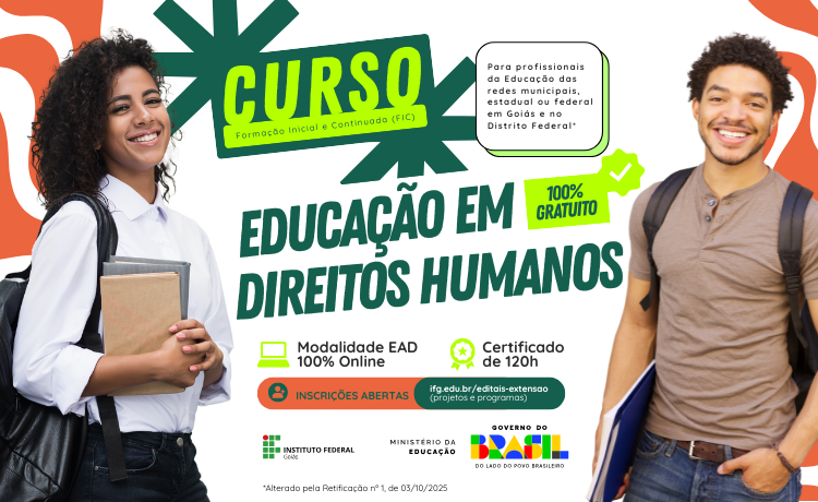 Estão abertas até dia 12 de outubro as inscrições para profissionais interessados em realizar o curso de extensão em Educação em Direitos Humanos do Instituto Federal de Goiás (IFG), em parceria com a Secretaria de Educação Continuada, Alfabetização de Jovens e Adultos, Diversidade e Inclusão do Ministério da Educação (SECADI/MEC). O curso é destinado a profissionais da educação básica das redes públicas de ensino municipais, estadual e federal em Goiás e no Distrito Federal*.