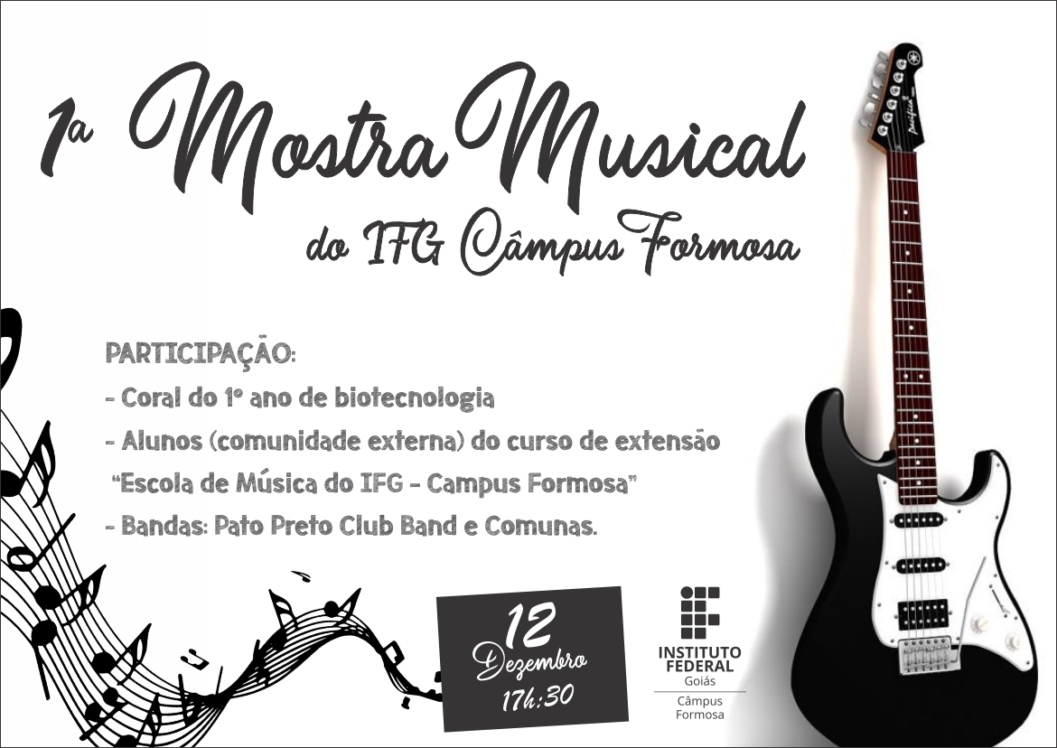 O ano de 2019 foi um sucesso no quesito música no Câmpus. O curso de Extensão “Escola de Música do IFG – Formosa” apresentou 120 candidatos a participantes da comunidade interna e externa, sem contar as inúmeras apresentações musicais realizadas por alunos do ensino médio do Câmpus Formosa do Instituto Federal de Goiás (IFG).