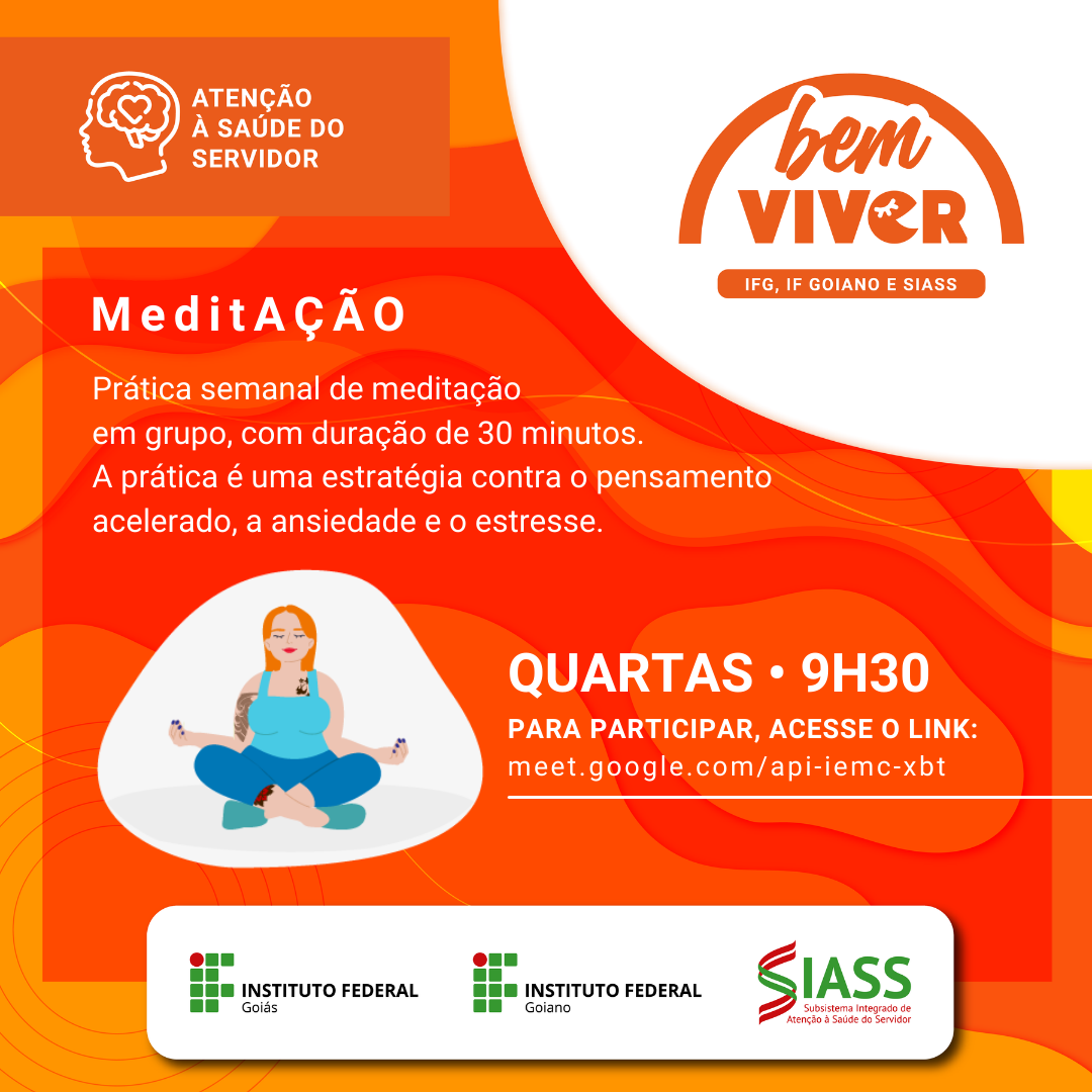 Entre as primeiras ações que estão previstas, destacam-se três, todas no eixo Atenção à Saúde do Servidor. A primeira delas é a MeditAÇÃO, sempre às quartas-feiras, às 9h30. O primeiro encontro será realizado via google meet (https://meet.google.com/api-iemc-xbt), no dia 24 de fevereiro. A atividade MeditAÇÃO é uma prática de meditação em grupo, com duração de 30 minutos, que ocorrerá semanalmente.