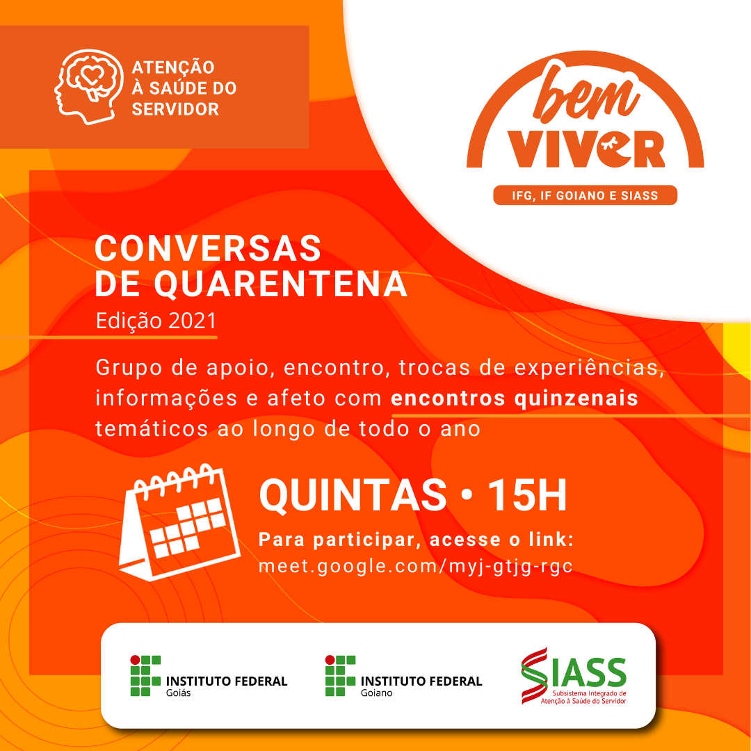 E a terceira ação é a Conversas de Quarentena Edição 2021, no mesmo eixo, sendo o primeiro encontro no dia 4 de março, às 15 horas, sempre via google meet (https://meet.google.com/myj-gtjg-rgc). Essa atividade é um grupo de apoio, com encontros, troca de experiências e informações, com reuniões quinzenais (às quintas-feiras, sempre 15 horas) e temáticas diferentes ao longo de todo o ano.