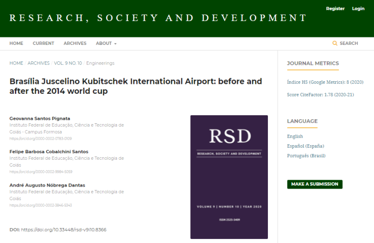 Essa não é a primeira vez que o professor André Augusto e os alunos Felipe e Geovanna tiveram artigo publicado na revista Researche, Society and Development. Em setembro de 2020, a publicação também dizia respeito à infraestrutura de transportes do país, com a pesquisa Aeroporto Internacional de Brasília Juscelino Kubitschek: antes e depois da Copa do Mundo 2014.