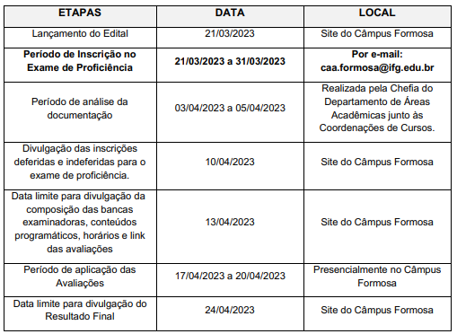 O Departamento de Área Acadêmica (DAA) do Câmpus Formosa do Instituto Federal de Goiás (IFG) publicou hoje o Edital nº 11/2023, que abre o período de inscrição para o Exame de Proficiência referente ao primeiro semestre de 2023. Estudantes do ensino superior regularmente matriculados em um dos cursos do Câmpus Formosa podem participar.