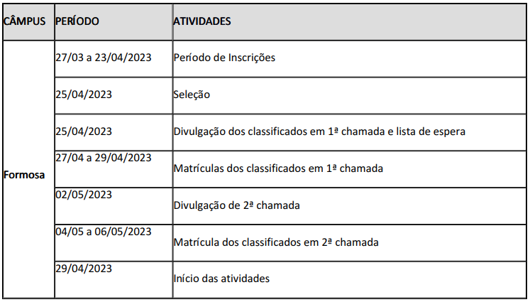 A seleção será na Gepex, por meio de sorteio eletrônico, a ser realizado às 11 horas do dia 25 de abril. As listas de candidatos selecionados e de espera serão divulgadas a partir de 25 de abril, no site do Câmpus Formosa do IFG, no endereço eletrônico https://www.ifg.edu.br/formosa/campus/extensao/editais .