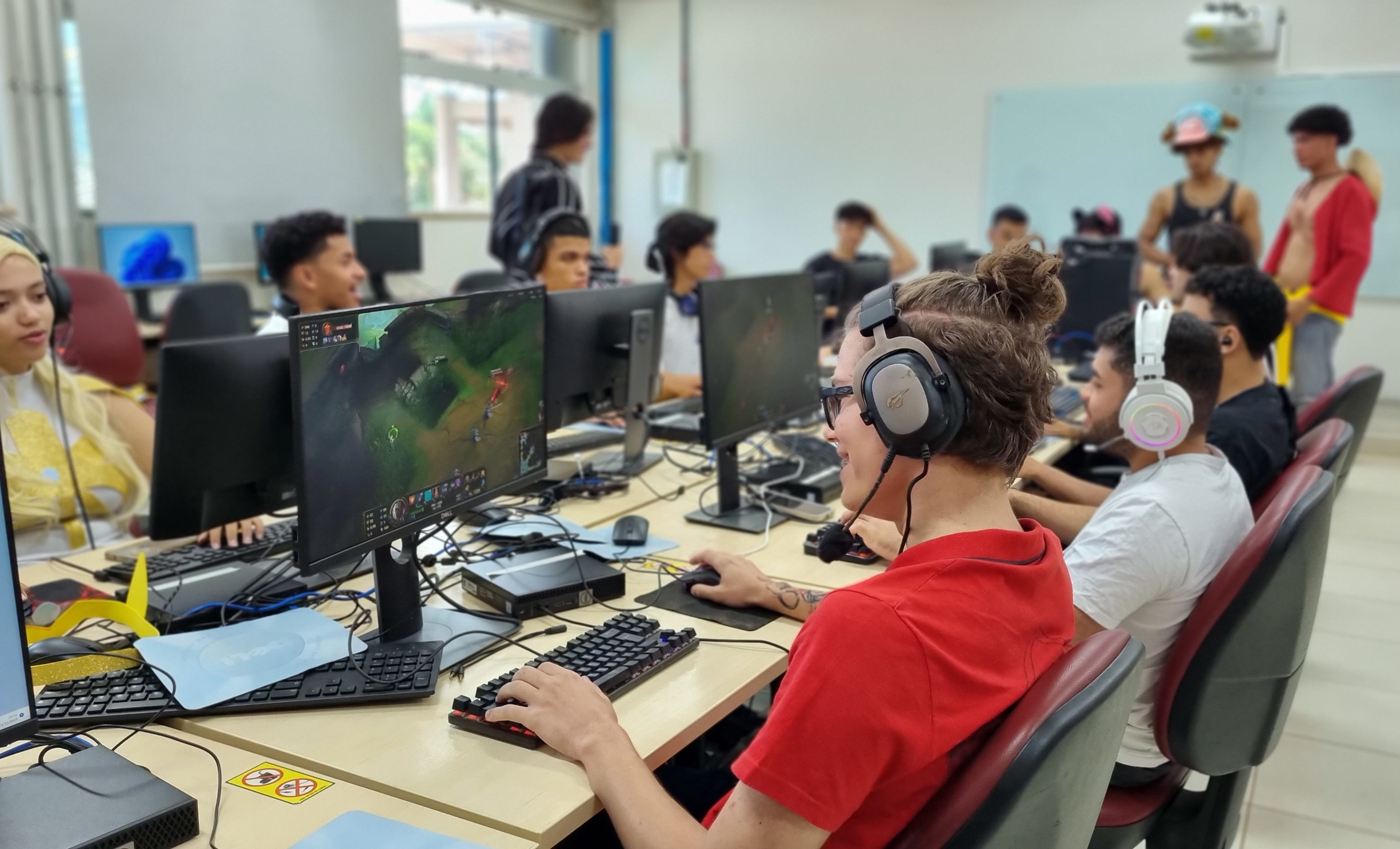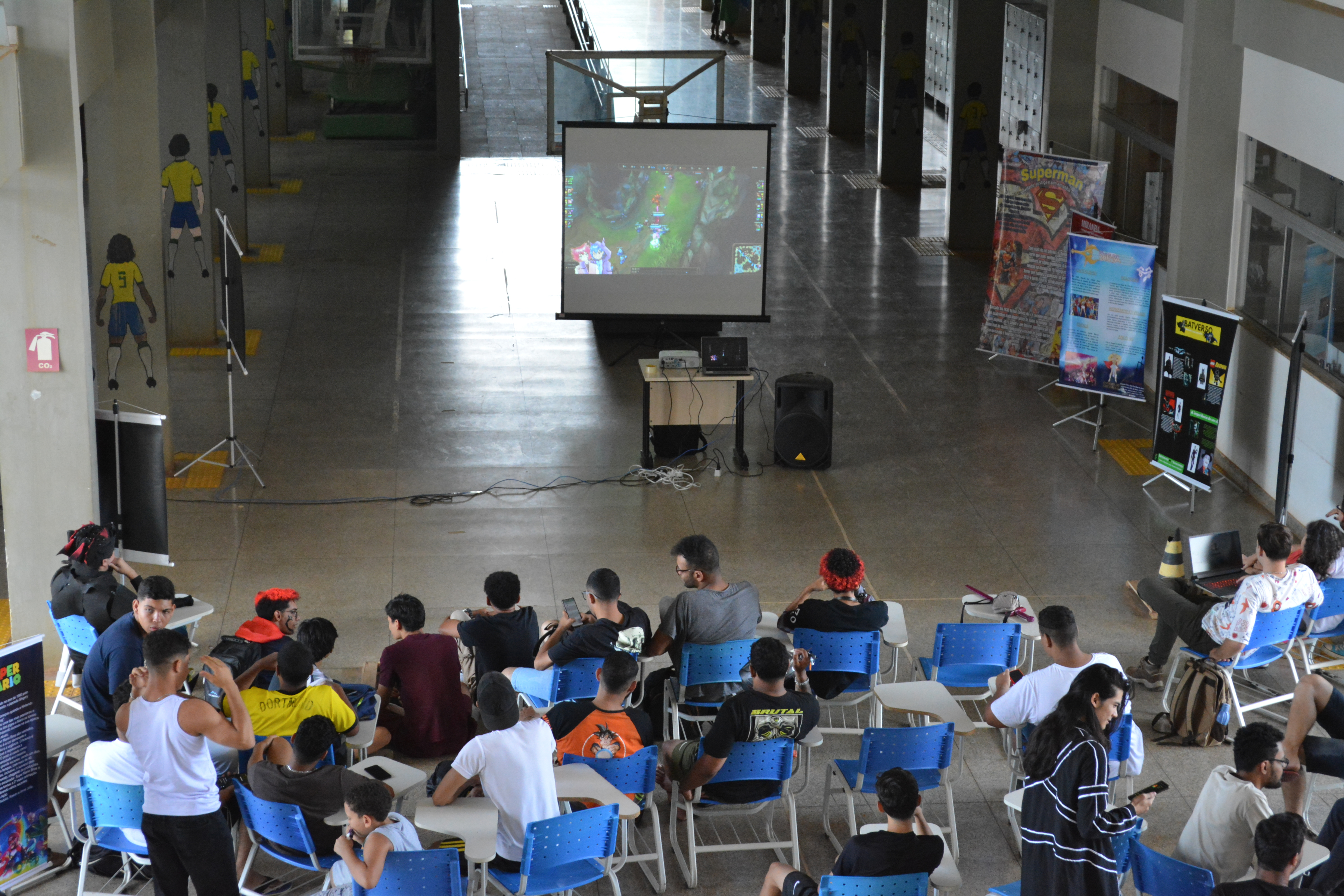 A manhã começou com as competições de League of Legends (LoL) e Free Fire. Quem não estava nos games, no Laboratório de Informática e sala S506, pôde acompanhar as disputas pelo aparelho celular ou pelo telão estrategicamente montado no saguão do Bloco Acadêmico, já que as competições foram transmitidas ao vivo pela Twitch TV.