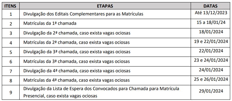 Caso haja candidatos desistentes, haverá três novas chamadas e, por fim, a Chamada para Matrícula Presencial, com o intuito de preencher as vagas ociosas, conforme a ordem de classificação contida no Resultado Final. A seleção para os cursos técnicos integrados em Biotecnologia e Saneamento 2024 ocorreu por meio de sorteio eletrônico de vagas no dia 4 de dezembro. O início das aulas está previsto para 19 de fevereiro.
