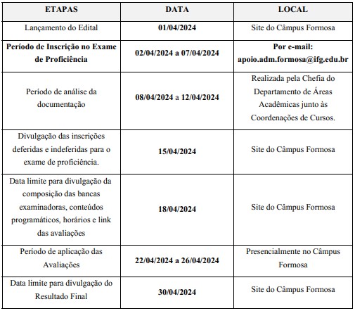 A prova poderá ser na modalidade objetiva ou discursiva, dentre outros instrumentos de avaliação, a depender da decisão da Banca Avaliadora. O Exame deverá ser aplicado entre os dias 22 e 26 de abril. As informações sobre o dia, o horário, o local, formato, conteúdo e referências bibliográficas serão divulgadas no site do Câmpus Formosa, até 18 de abril. Será considerado apto o candidato que apresentar nota igual ou superior a 8,0. O resultado final dos exames será publicado até 30 de abril.