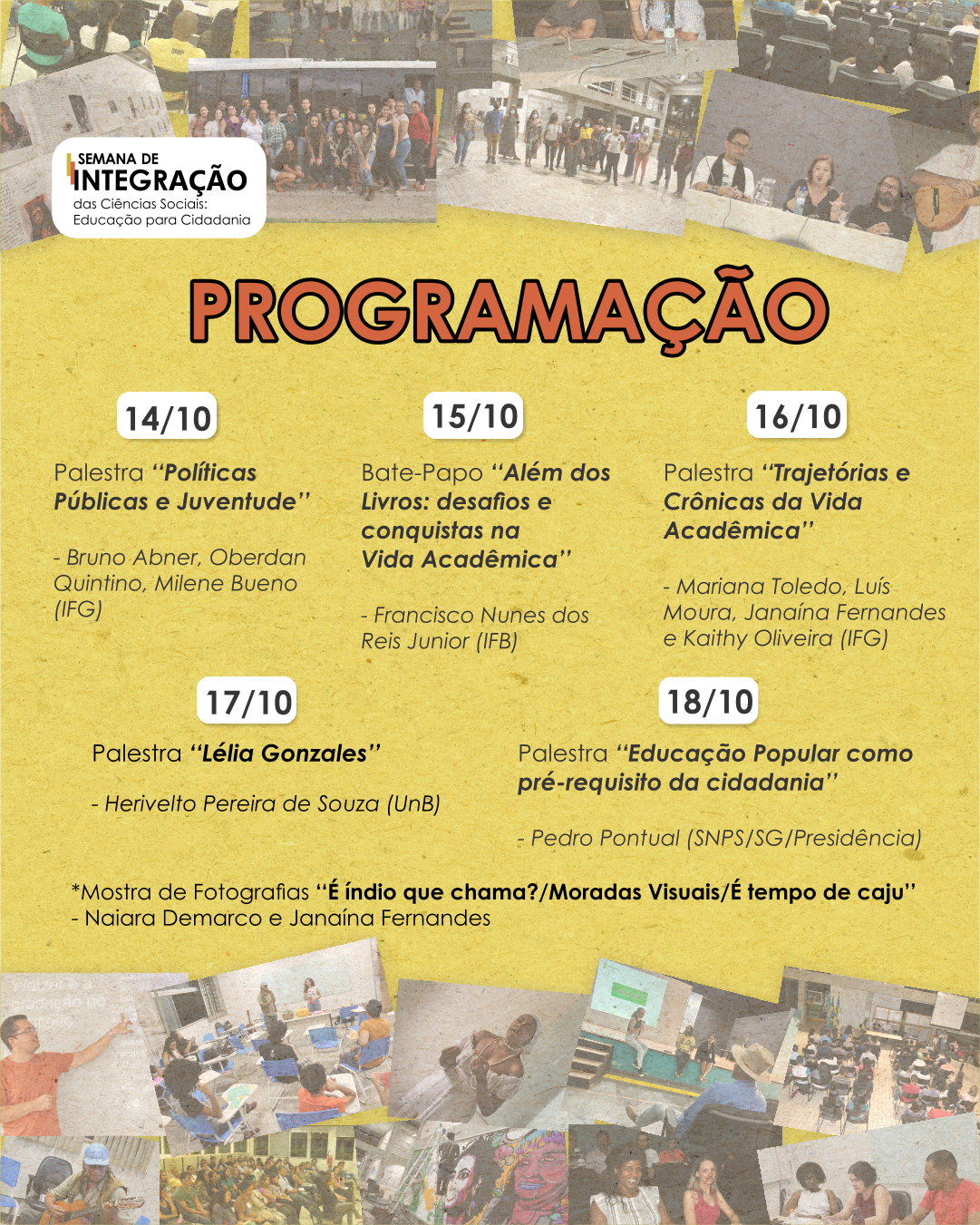 Estudantes de Ciências Sociais (LCS) e da pós-graduação Educação para Cidadania terão encontro marcado com a Semana de Integração das Ciências Sociais: Educação para a Cidadania, de segunda a sexta-feira da próxima semana. Mas o evento não é destinado exclusivamente a este público, alunos de outras licenciaturas, do Câmpus Formosa ou externos, também poderão participar.