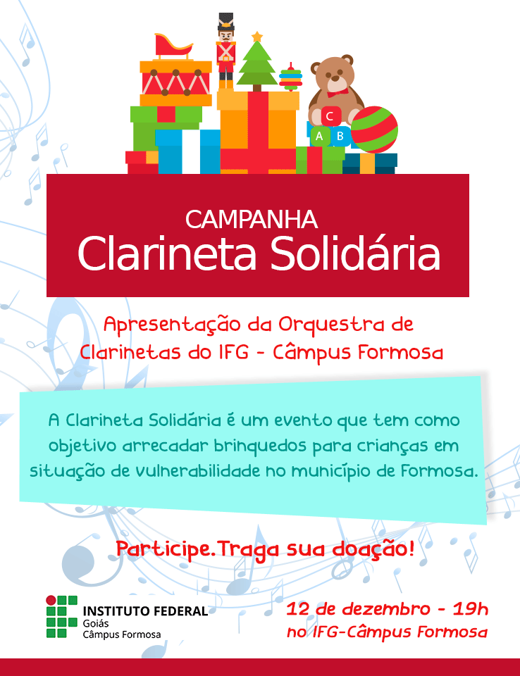 Após a arrecadação de brinquedos pela Orquestra de Clarinetas do Câmpus Formosa, o grupo fará a entrega dos donativos a crianças carentes de Formosa no sábado, 22 de dezembro, às 17 horas, na Rua 20 do Setor Jardim Oliveira, com apresentação da orquestra do Câmpus e de clarinetistas de Brasília, do Projeto Clarinetas de Natal.