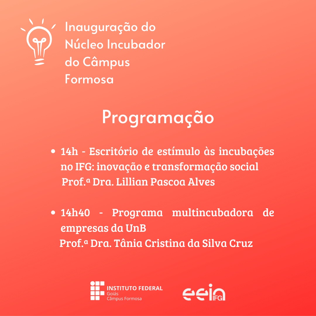 - 14h - Palestra "Escritório de estímulo às incubações no IFG: inovação e transformação social", com professora draª. Lillian Pascoa Alves, diretora de Ações Profissionais e Tecnológicas do IFG.