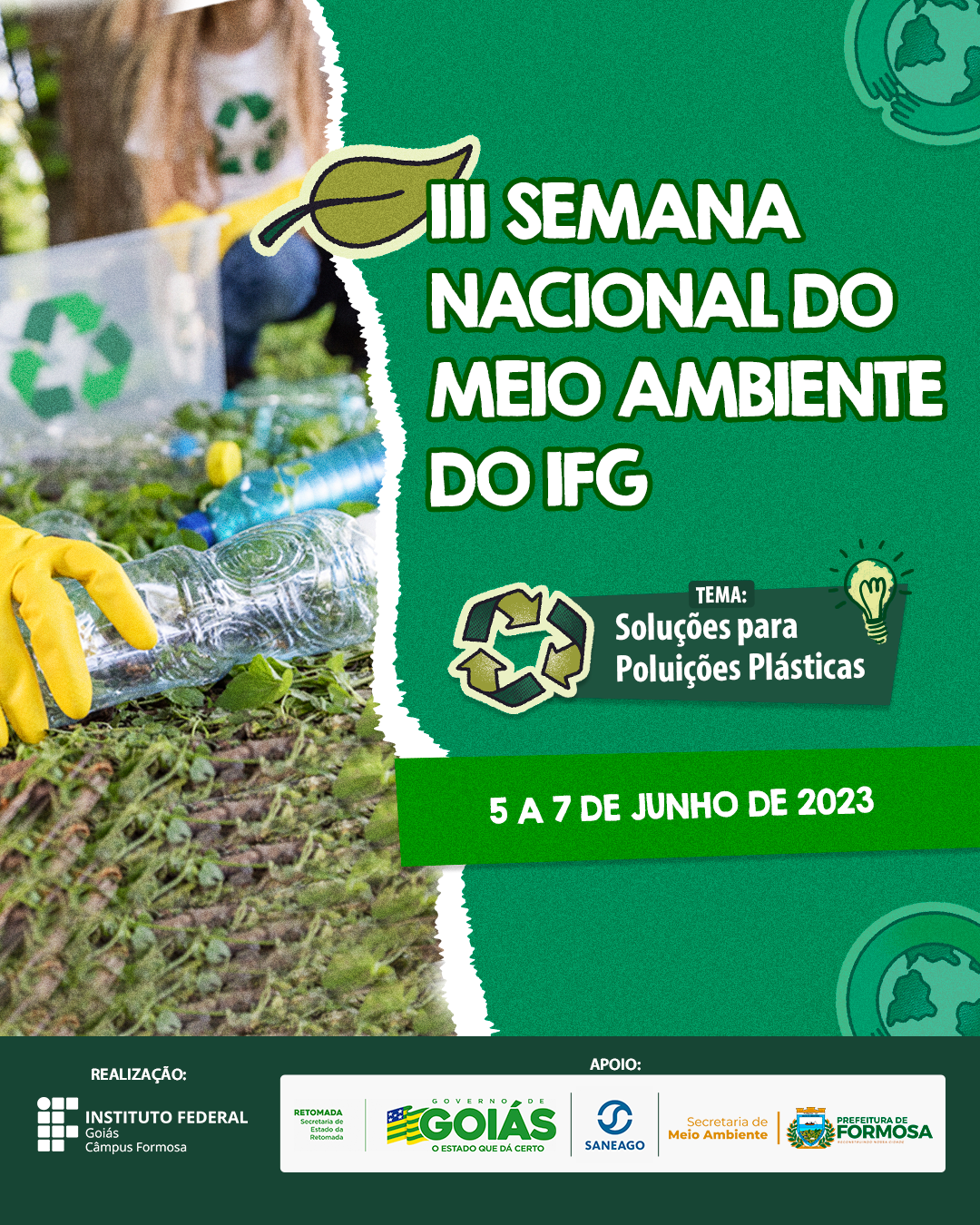 O Câmpus Formosa do IFG vai comemorar o Dia Mundial do Meio Ambiente com mais de 20 atividades, entre 5 e 7 de junho, durante a III Semana Nacional do Meio Ambiente. Palestras, oficinas, rodas de conversa, apresentações musicais, trilha, exposições para relembrar a importância do meio ambiente para a vida na Terra. As atividades são gratuitas e abertas para toda a comunidade formosense e regional. Inscreva-se! As inscrições são feitas pelo Sistema Unificado de Gestão da Extensão e Pesquisa (Sugep) do IFG, no link https://sugep.ifg.edu.br/eventos//#/publico/eventos/3cb844b7-6b06-4d93-8757-fb95017c60e8/inscricao . Participantes recebem certificado. São apoiadores do evento a Saneago, Secretaria Municipal de Meio Ambiente de Formosa e Secretaria do Estado da Retomada de Goiás.
