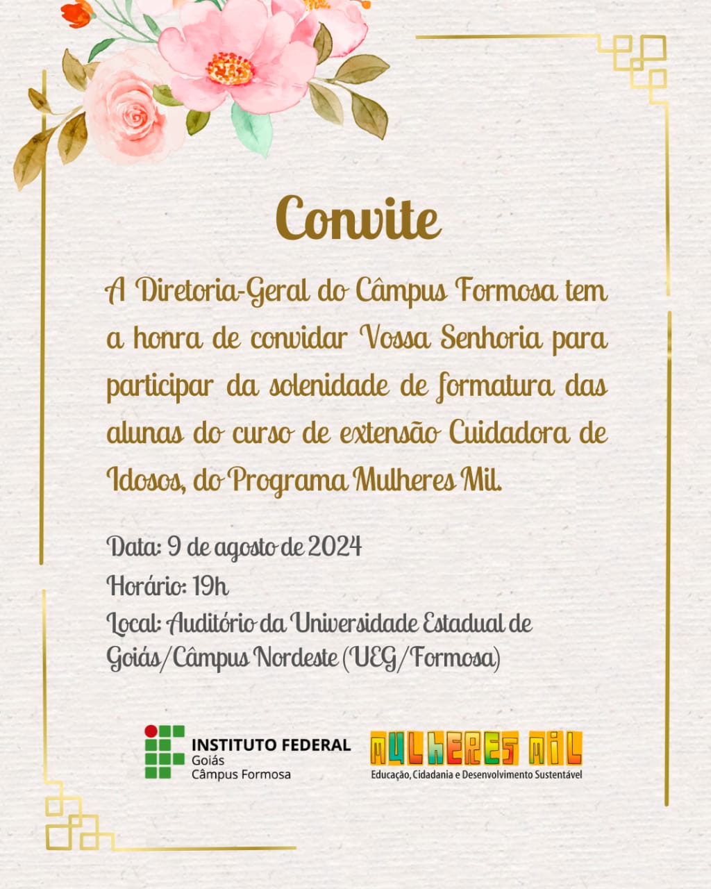 Será no dia 9 de agosto, sexta-feira, a cerimônia de certificação das alunas do 1º Ciclo do curso Cuidadora de Idosos, do Programa Mulheres Mil. A solenidade será realizada no Auditório do Câmpus Nordeste da Universidade Estadual de Goiás (UEG).