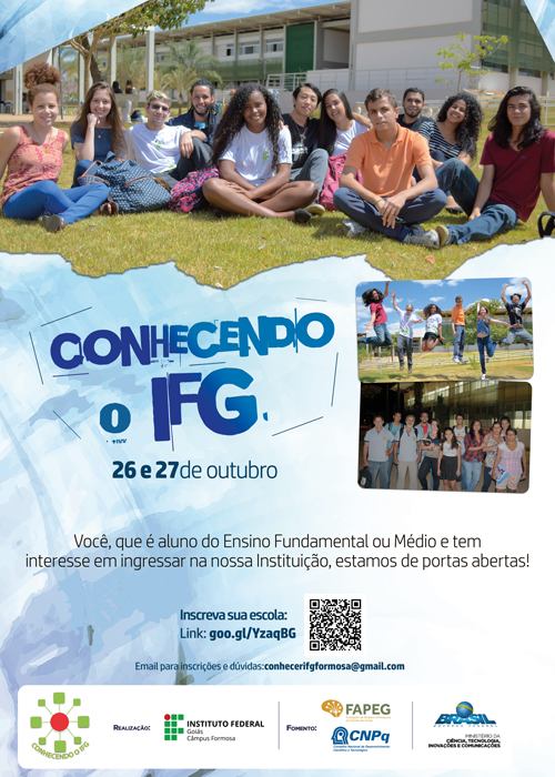 Em 2017, o Conhecendo o IFG receberá estudantes das diversas escolas do município e região, bem como todos os interessados em conhecer a instituição, nos dias 26 e 27 de Outubro. A novidade deste ano é que o turno vespertino do dia 26 de outubro será reservado para alunos de 1ª a 5ª série do ensino fundamental, permitindo aos pequenos o acesso a novos conhecimentos.